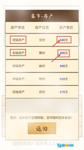 在【集市-房产】界面里,你可以选择【初级房产】,其中交州的售价是【540文】,豫州的售价为【405文】,通过消耗铜钱进行购置,以此来提升宗族的收入。