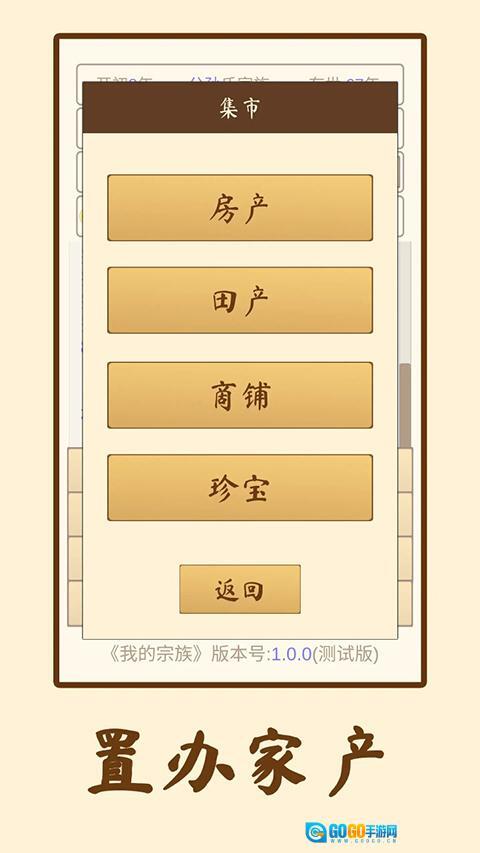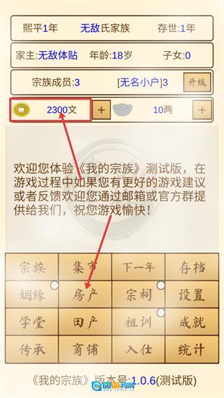 开局后可以查看当前拥有的【2300文】资源,接着点击界面上的【房产】选项,进入对应的界面去购置房产,以此为宗族积累资产。