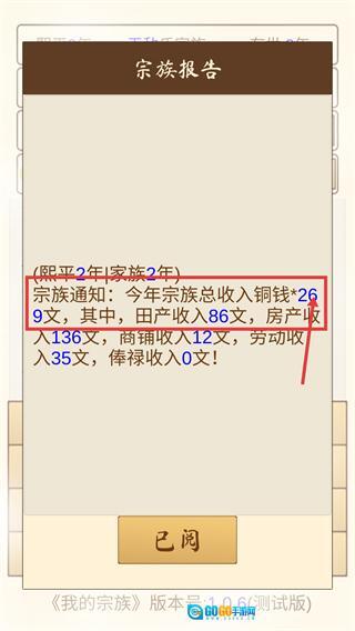 查看【宗族报告】可了解到本年总收入为铜钱*【269文】,其中包含【房产收入】等项目,确认信息无误后,点击【已阅】关闭报告即可继续发展。