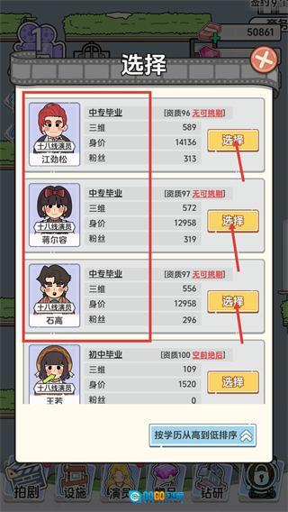 在演员选择界面,建议优先选择【资质】更高的演员(比如江劲松-96这类),然后点击【选择】按钮来确认参演人员。