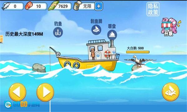 走到船的左边去开启垂钓设备,用左右方向键操控鱼钩的移动轨迹,在水里找到鱼并让鱼钩碰到它们。