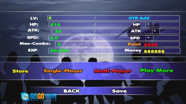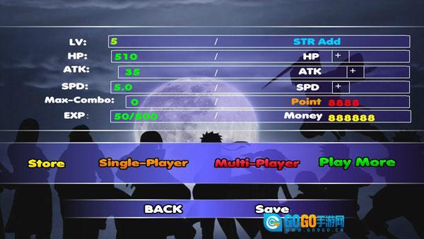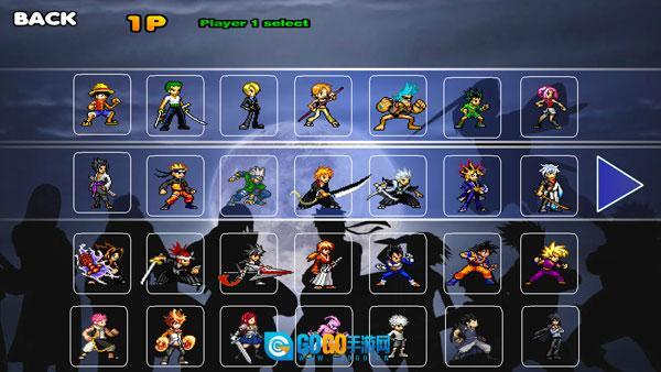 这款游戏包含单人游玩与双人合作两种模式,接下来将以单人模式进行演示说明。首先需要挑选一位自己心仪的角色,可供选择的角色包括像路飞、鸣人、死神这样广为人知的角色。