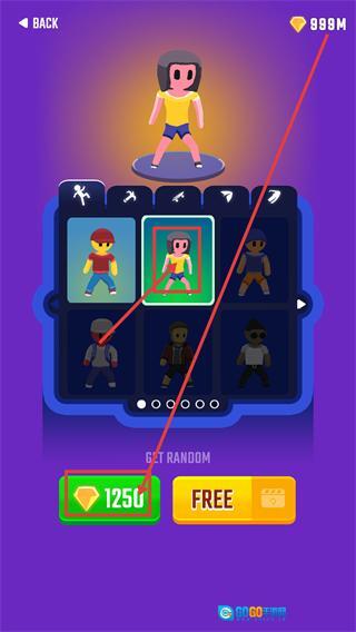在角色选择界面,你可以消耗【1250钻石】解锁新角色,也能点击【FREE】按钮,通过观看广告来获取免费角色。