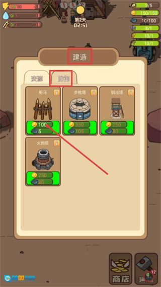在【建造】界面的【防御】标签下,消耗【100金币】与【5矿石】即可建造【拒马】,以此提升防御能力。