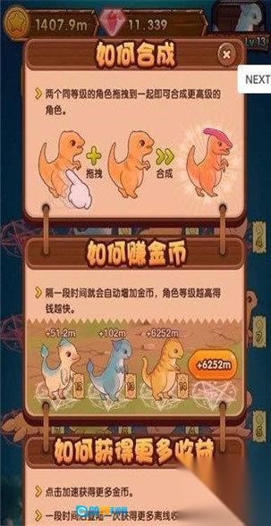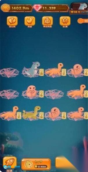 合成升级玩法:把两只等级相同的恐龙进行合并,它们就能进化为更高级的品种,从而提升自身价值。