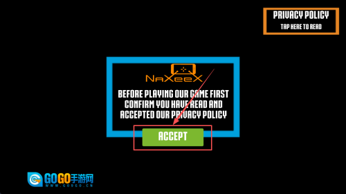 在游戏启动界面,阅读隐私政策后,点击“ACCEPT”按钮以表示接受该政策。