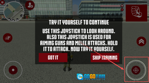 学习操作:根据屏幕显示的提示,掌握运用操纵杆完成瞄准与近战攻击的方法。