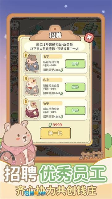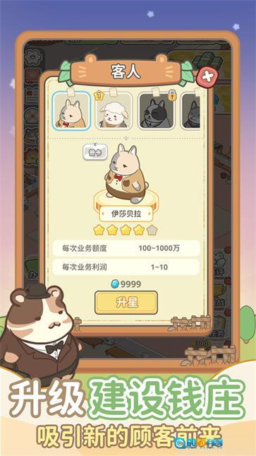 这是一款主打钱庄经营的放置类养成游戏,整体风格轻松休闲,能让玩家体验到独特的经营乐趣。游戏采用清新可爱的Q版卡通美术风格,构建了一个充满趣味的动物世界。玩家将扮演一只萌萌的小仓鼠,负责管理一家以橡果为主题的钱庄,目标是通过精心运营,让这家钱庄不断发展壮大。