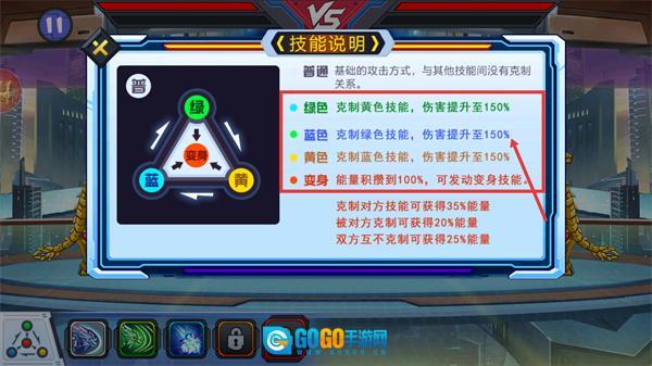 要熟悉【技能说明】里的克制关系:【绿色】克制【黄色】、【蓝色】克制【绿色】、【黄色】克制【蓝色】,释放相应的技能能够提高150%的伤害。