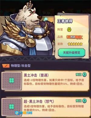 有一位名为王者彼得的传说级骑士,定位是物理队伍的辅助角色,在功能上可作为克鲁索的替代选择,且获取成本相对较低。其角色碎片主要通过副本扫荡来收集,是性价比很高的传说骑士之一。他具备为队伍提供熊族属性增益以及裂伤效果加成的能力,同时也是解锁孔明与女王更高等级的关键材料之一。