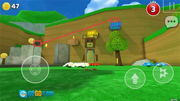 当前金币数量是【47】,【Life】数值维持在3,玩家需要操控角色进行移动,通过跳跃的方式接近高处的机关,解锁【蓝色箱子】来获取里面的物品,并且收集这个场景里的所有金币。