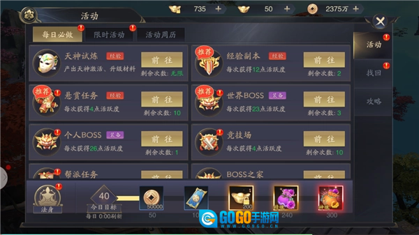 强化装备、升级技能、合成物品、镶嵌宝石、精炼道具,这些玩法都需要消耗大量铜钱和各类材料。不过获取这些材料的途径往往比较零散,而每日必做任务则能清晰地提醒玩家,当天还有哪些事项尚未完成。