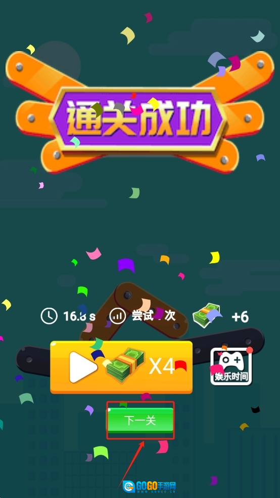 点击“下一关”按钮继续游戏。
