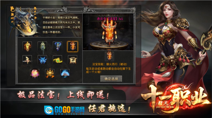 上线就送十一件上古法宝,像赤炎金能被动生成火墙,提升职业战斗策略性。
