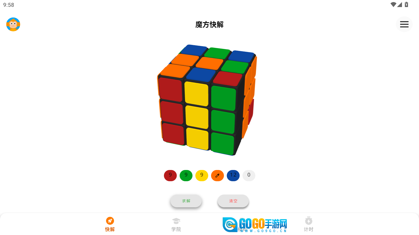 快解功能:在模拟界面,手指滑动即可旋转魔方任意面,颗根据魔方的六个面、每个面12个小格子自定义设置颜色,平时现实生活中遇到的