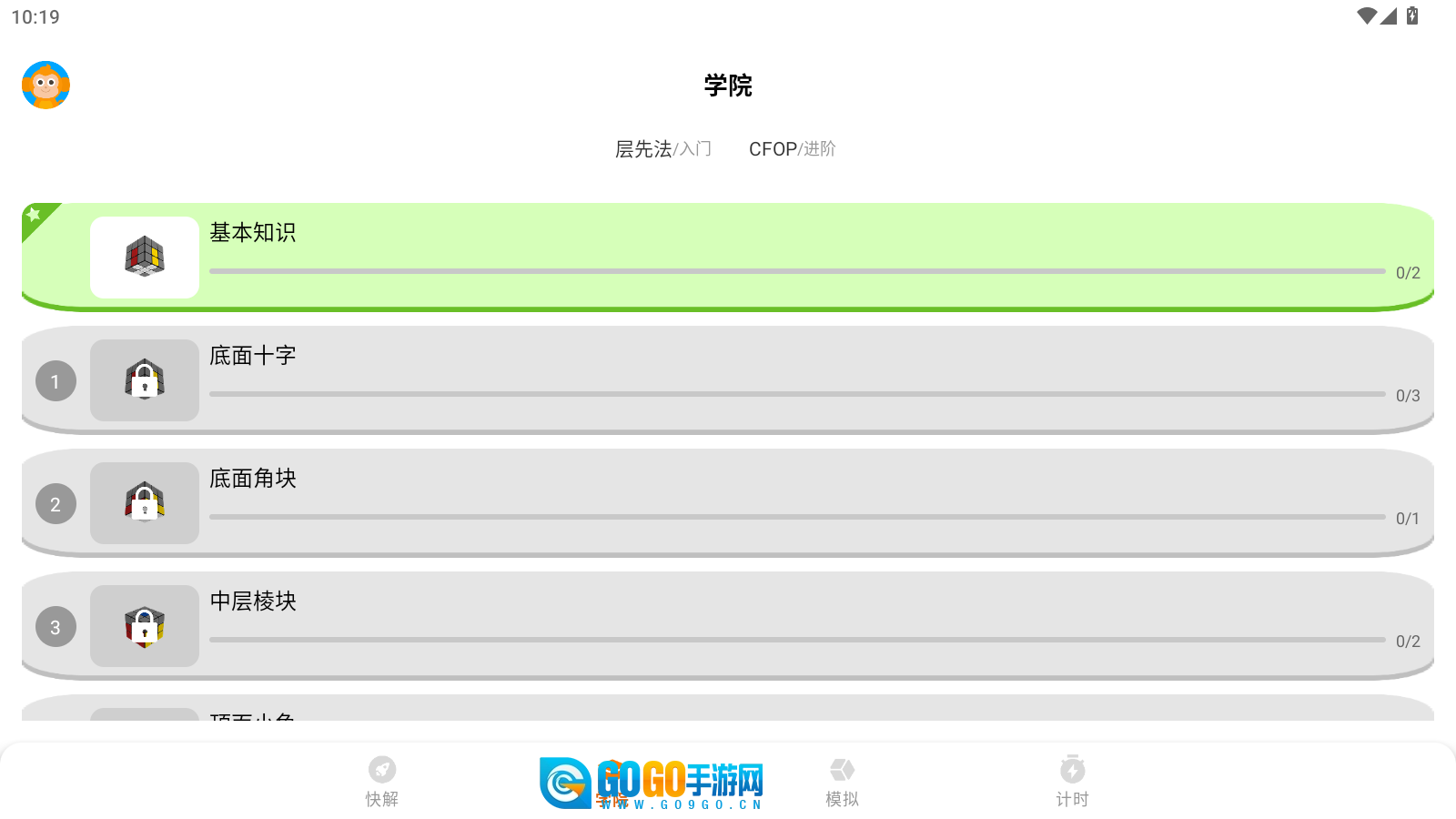打开游戏后,首先看到的是底部四个实用性很强的功能选项,分别是快解、学院、模拟和计时等功能模式。