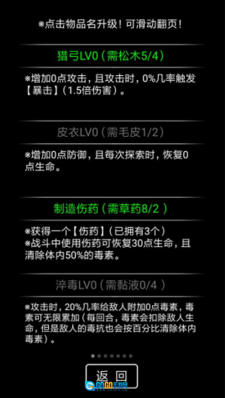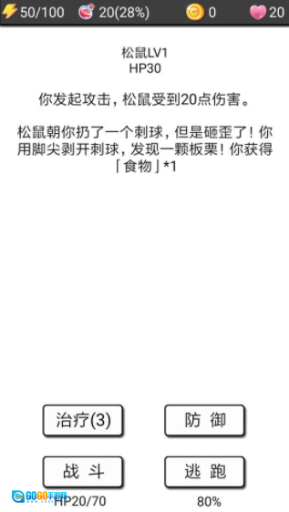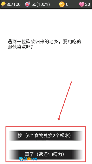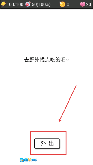 开始冒险后,你首先要做的就是寻找食物。点击“外出”,再点击“探索”,系统会随机触发一个事件,同时消耗你的精力。