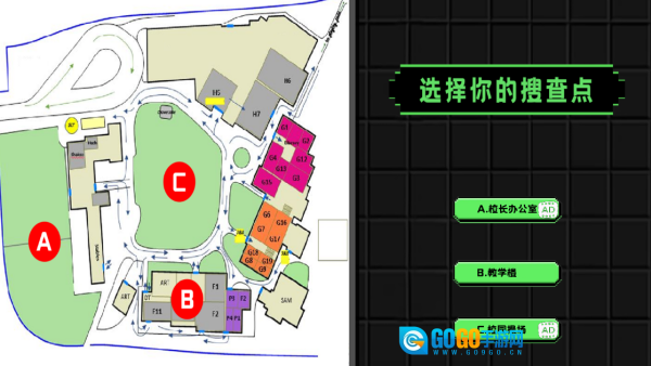 如下图所示,有办公室、教学楼和操场这三个地图场景可供游玩。