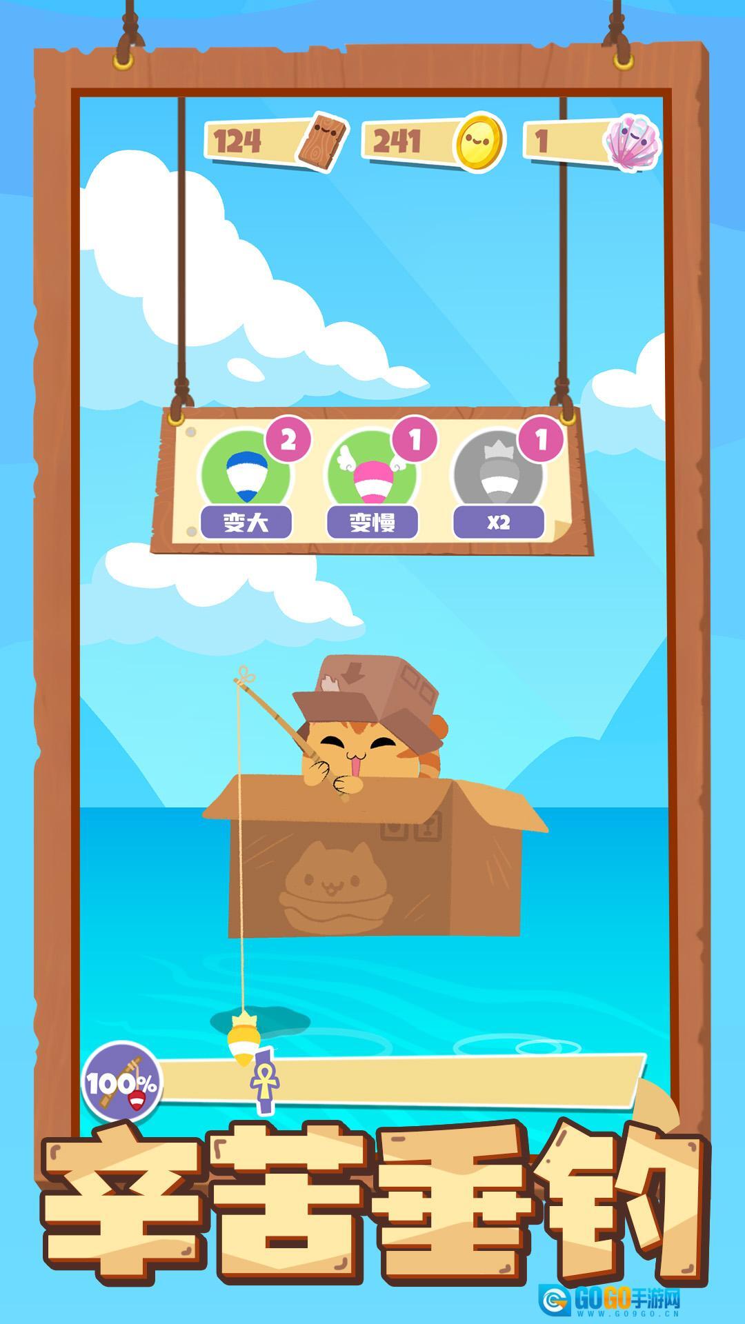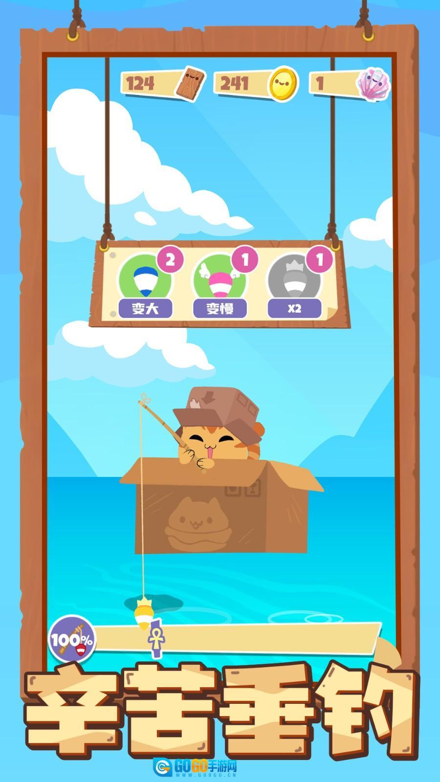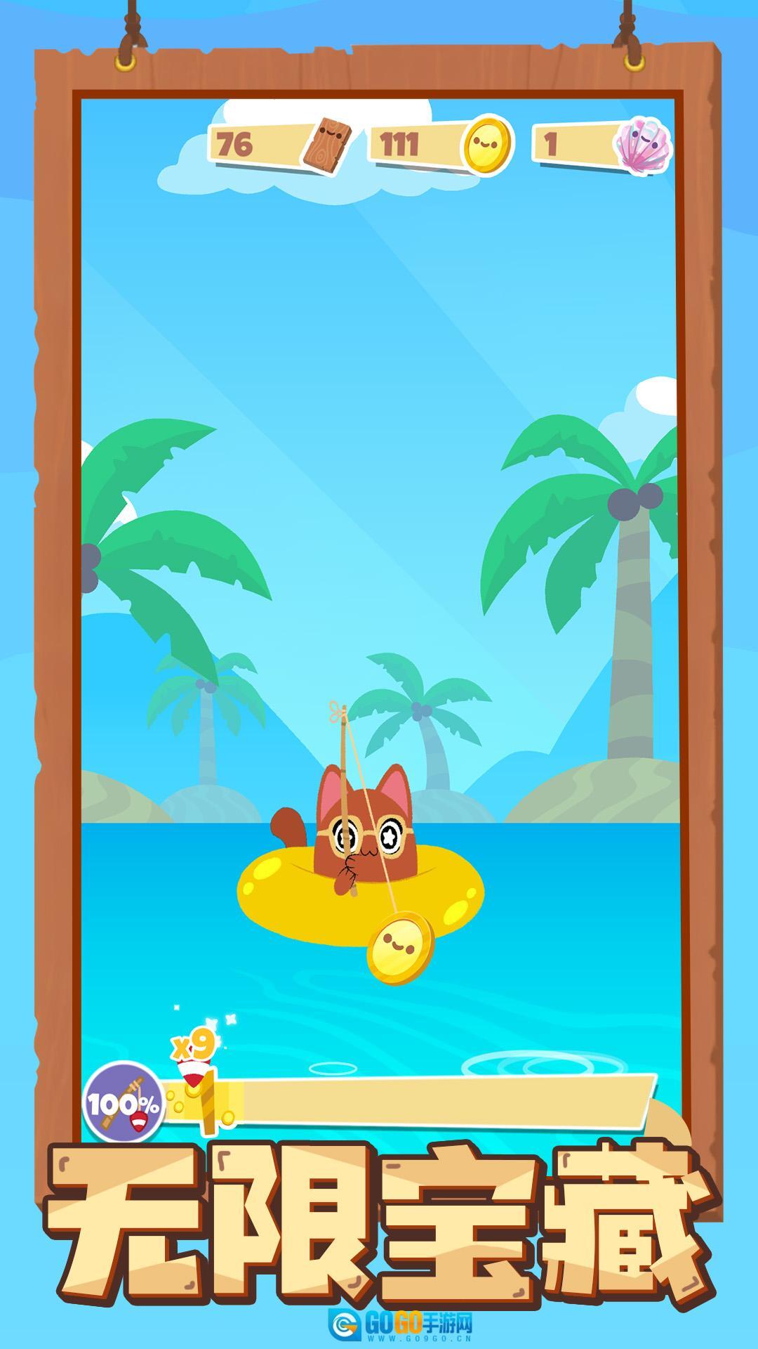 你可以操控猫咪完成钓鱼任务,耐心等待鱼儿咬钩后,按照提示操作拉杆,就能钓取到金币、木材和宝藏啦。