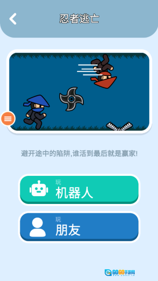 如下图所示,我选择了忍者逃亡玩法。可以选择和朋友或是机器人一起挑战。
