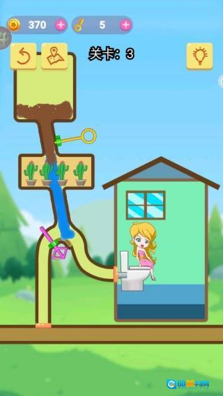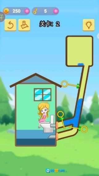 需要认真观察管道的排布情况,思索怎样通过抽拉别针来调整水流的走向,最终使洁净的水流进小姐姐的水杯里。