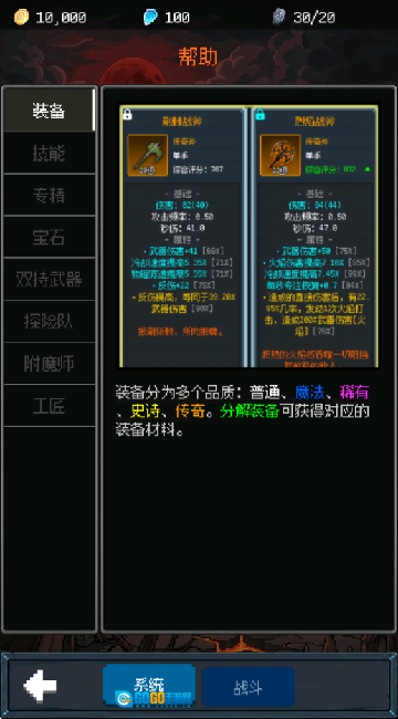 进入帮助页面后,你可以查看游戏攻略,其中包含了装备、技能和专精的详细属性说明。