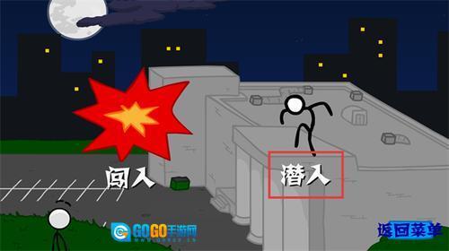 在潜入阶段,你需要按照指引操控火柴人使用相应道具,在目标建筑旁的草地区域缓慢移动推进,一步步向建筑靠近,同时注意避开途中的危险。