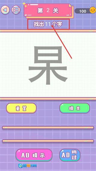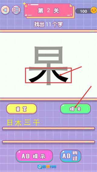 在找出“三”“日”“杲”等字之后,还得接着琢磨剩下的笔画,直到把11个字都凑齐才行。要是碰到难题,就能用【AD提示】来获取有针对性的线索。