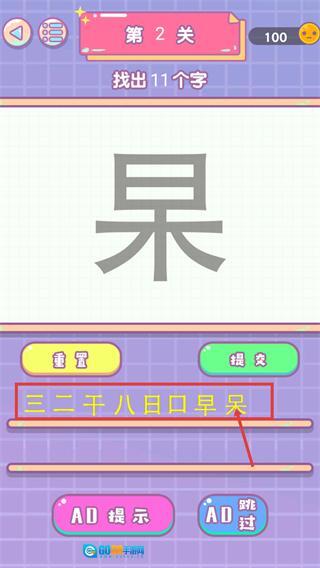 在第二关中,要从汉字【杲】里找出11个字。可以先从顶部的“日”这类比较明显的部件开始,一步步拆解并辨认能组合成的字,这样来积累答案。