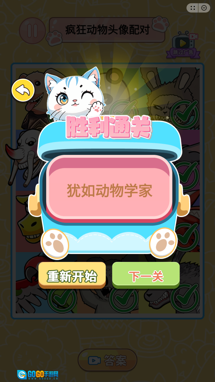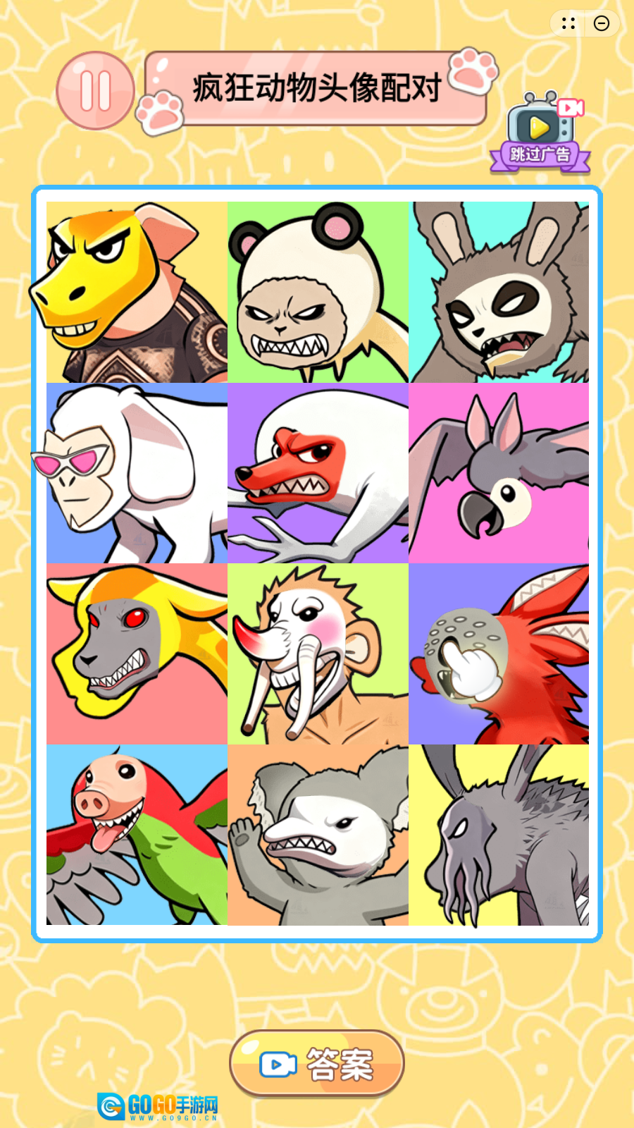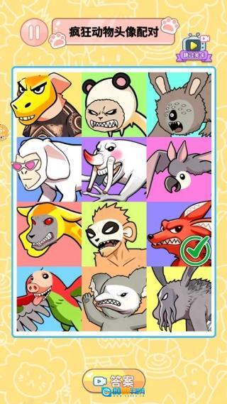 在网格里认真查找,找出和已抽取头像相同或者有联系的另一个趣味动物头像,成功配对就能通过关卡。