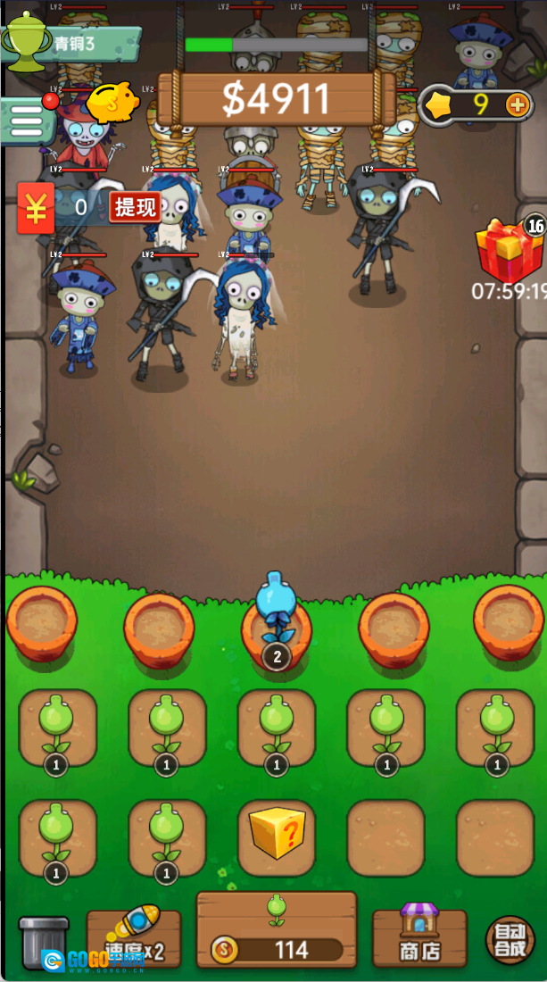 部署与作战:把合成好的植物栽种到战场上,它们会主动攻击前来进犯的僵尸,守护你的庄园。