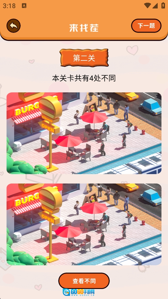 核心找茬玩法:在两张外观相似的图片里,找出规定数量的不同点,点击对应位置即可完成标记。