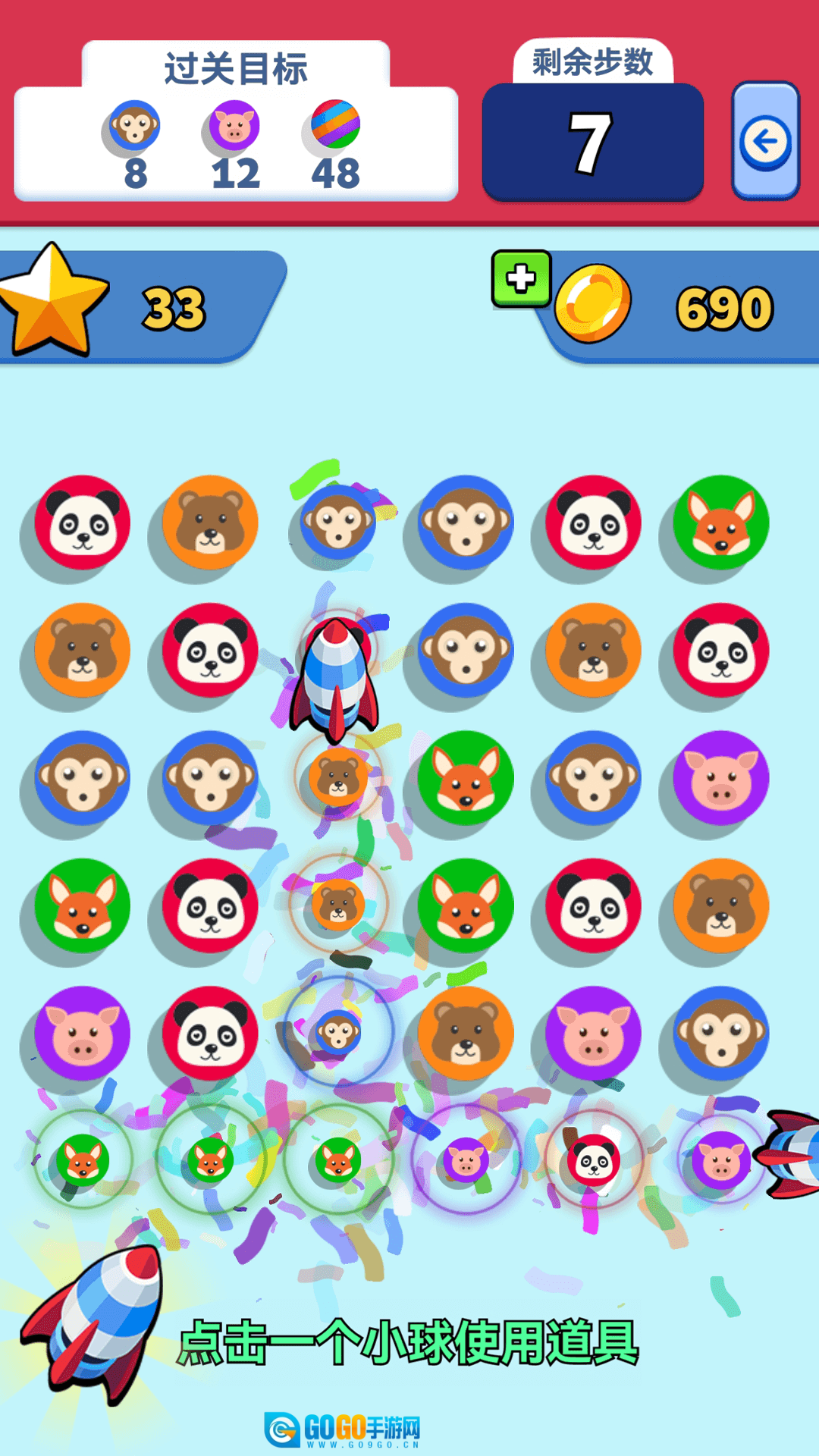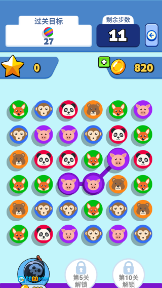 玩家用手指滑动来连接相邻且相同的动物徽章,只要连线长度不少于三个就能完成消除。