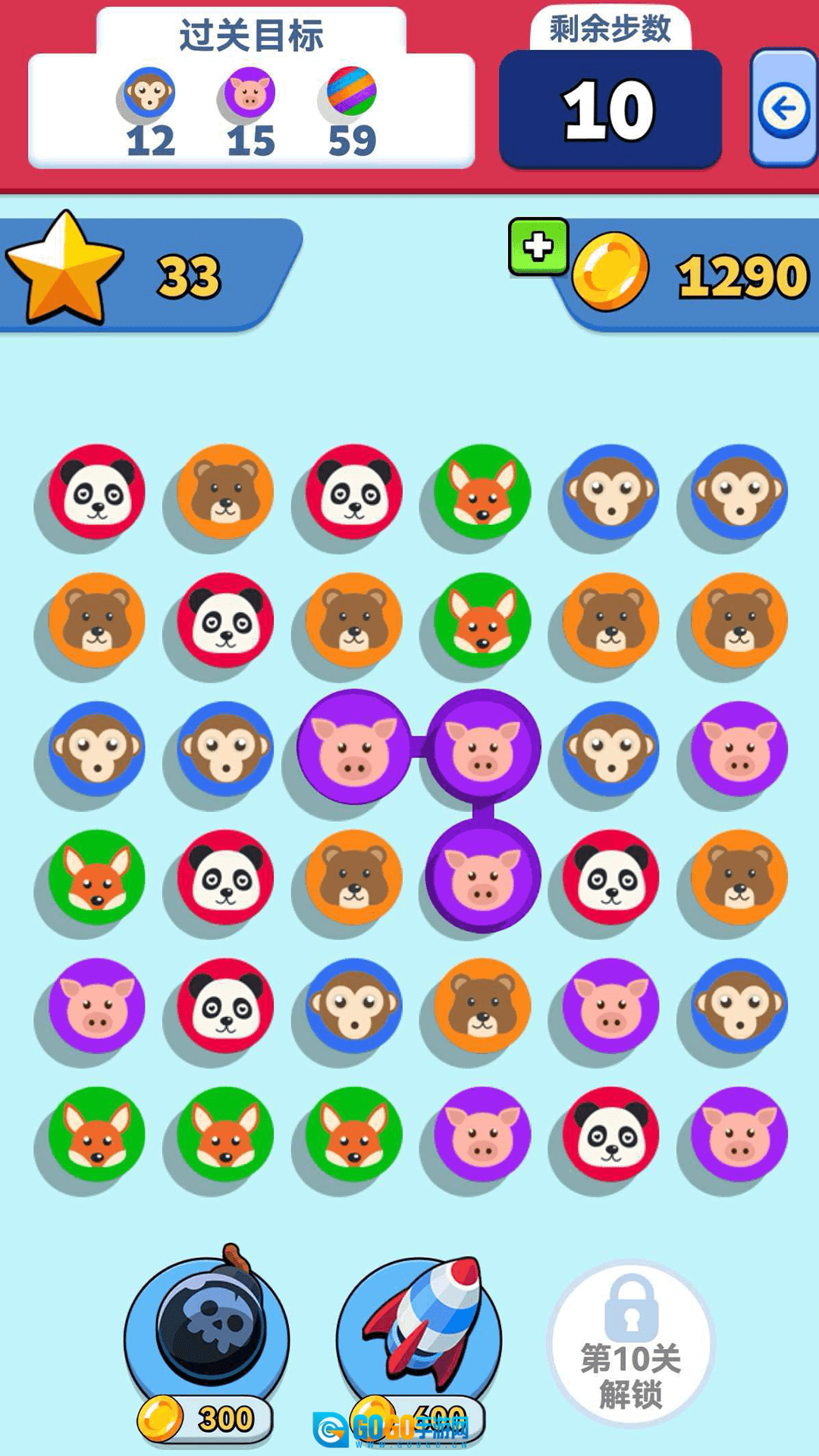 像图中展示的这样,我成功把紫色的小猪徽章连在了一起,只要有至少三枚一样的徽章被连起来就能消除。