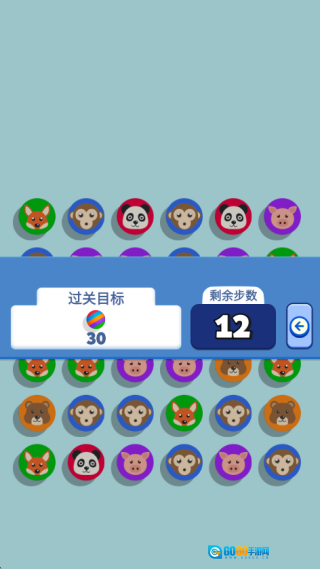 如图所示,在第一关中,玩家需在12步的限制步数内,成功消除30枚徽章方可通关。