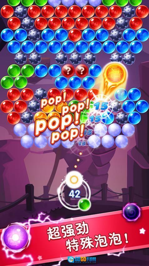 射出的泡泡会粘在顶部的泡泡群上。当三个及以上同色泡泡连在一起时,它们就会一同消除。游戏目标是清除所有泡泡。2、每个关卡都有清晰的通关要求。随着关卡推进,泡泡的颜色种类会增加,排列方式也会更复杂(比如U型、倒三角型等)。3、高手级的玩法不只是简单的颜色匹配。你得规划好泡泡的射击路线,借助墙壁的反弹把泡泡送到难以直接命中的位置。