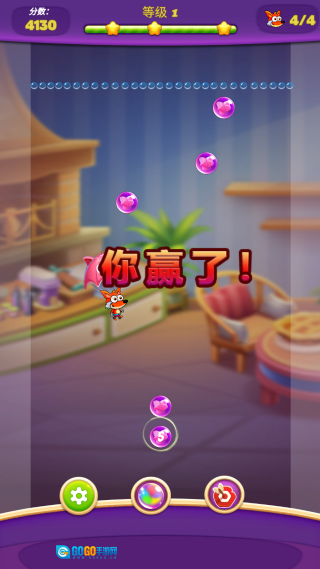 发射的泡泡颜色与顶部目标泡泡颜色一致消除过关。