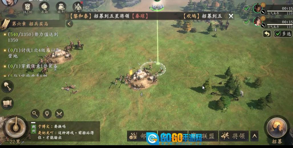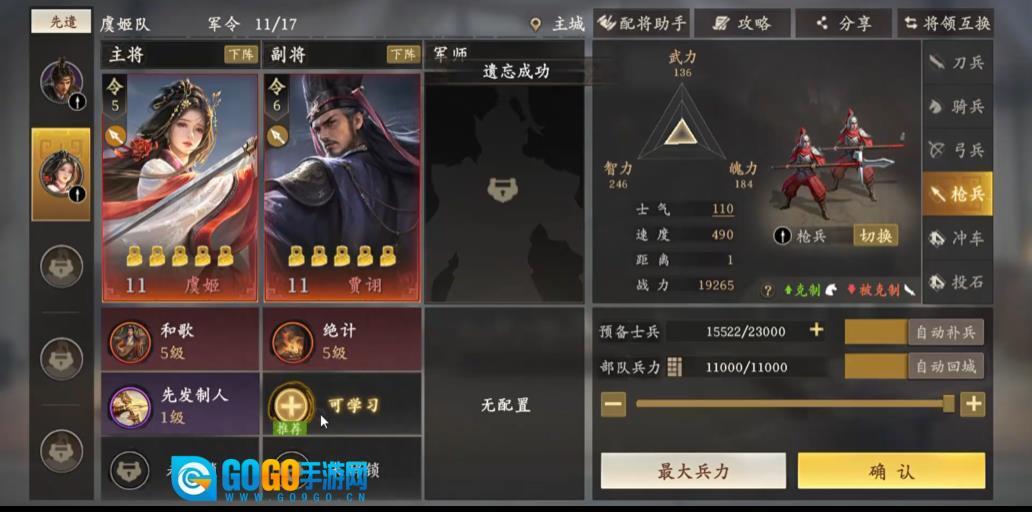 进入游戏后,先挑选主将与军师,再去熟悉他们各自的技能以及所带领兵种的特性。