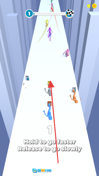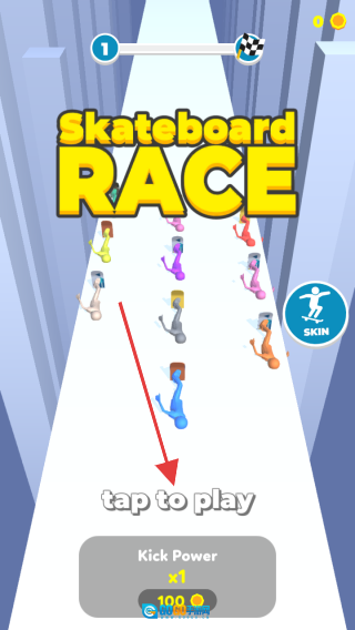 点击“tap to play”按钮即可开启游戏,你需要操控蓝色滑板角色,通过长按屏幕让角色加速,松开屏幕则会减速,在此过程中要避开彩色的对手,全力抢占赛道。