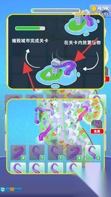 你可以操控各种形态的怪物,把它们拖放到城市地图上,怪物就会自动移动、破坏建筑,以此推进关卡,达成“摧毁城市”的目标并获得奖励。