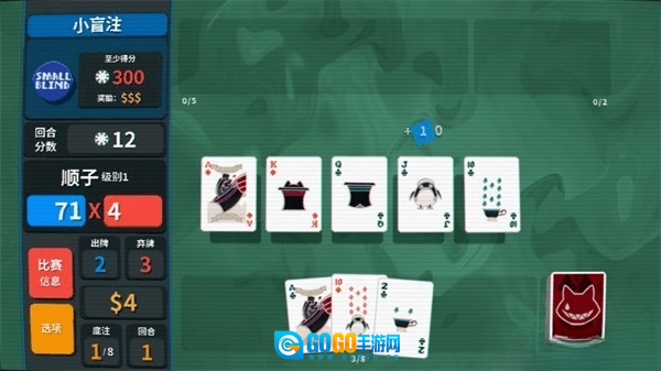 1. 玩家的目标就是不断赚取筹码来击败对手的盲注。盲注分为小盲注、大盲注以及Boss盲注三种。其中Boss盲注会对玩家的操作有所限制(比如方片牌不计分等),通关后“底注”会增加,难度也会随之提高。