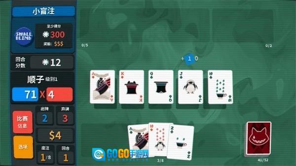 阴险小丑:如果出牌中包含一个顺子,+100筹码。
