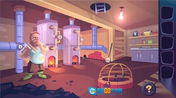 接下来用手电筒照射老鼠洞,得到一个螺丝帽。将螺丝帽插入指定位置,再用扳手顺时针拧紧螺丝帽。完成后师傅会给你一把钥匙,用这把钥匙打开图中被笼子罩住的地下室入口。沿着梯子下去,搬开桶子,获得一把斧头。最后返回楼上,用斧头砸开被木板封住的楼梯口,就能出去了。