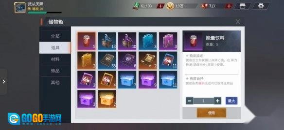 7、若在驾驶途中感觉疲惫,可打开储物仓的道具栏,使用能量饮料这类能恢复精力的道具。