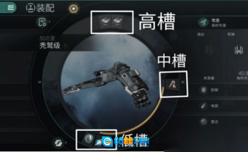 所有的舰船都有四种装备槽位:高槽-中槽-低槽-改装件高槽一般为武器,中槽一般为推进器和护盾增强装备,低槽一般为武器辅助装备以及装甲增强装备,改装件为辅助装备,可以提高某些属性。