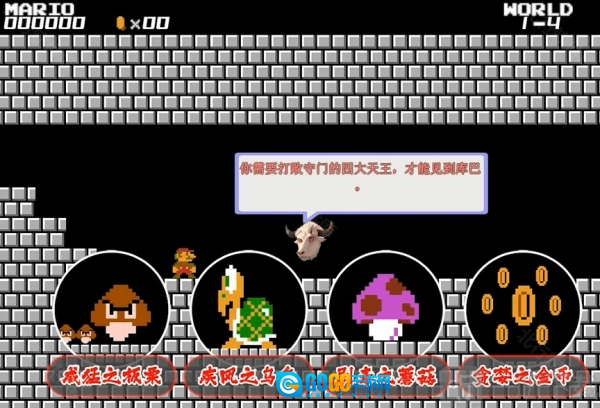 1、马里奥得先战胜镇守大门的四大天王,方能与库巴会面。这四大天王分别是:拥有威猛之力的板栗、行动迅疾如风的乌龟、身带剧毒的蘑菇,以及天性贪婪的金币。