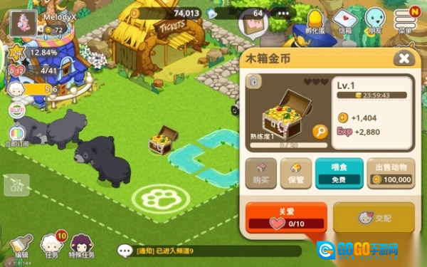 2. 喂养:定时喂动物拿金币经验,高级动物可出料理材料。活动会出主题动物,玩家通过做任务/交配限时获得。