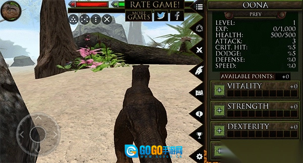 2、点击左上角的恐龙图标可打开更多界面,具体如下:玩家能查看自身等级与经验;界面右下方显示生命值、力量、敏捷等属性,此外玩家还可通过点击地图标识来查看当前所处位置。