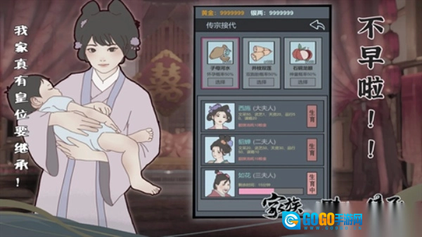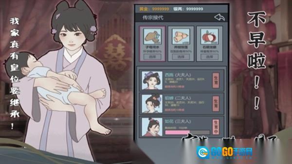 繁衍后代:点击生育,子嗣不仅能助力家族事务,还能增添声望。