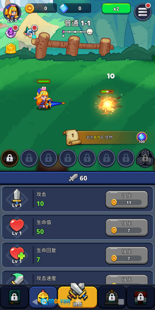 在战斗进行时,玩家能够花费金币提升角色的攻击力、生命值等各项属性,以此顺利击败关卡里的BOSS敌人!